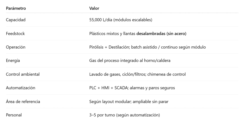 - Suministro e instalación de equipos (reactor de pirólisis, tren de condensación, destilador, lavado de gases).